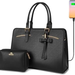 MATEIN Laptop Tote Bag for Women, Large Waterproof PU Leather Work Briefcase with USB Charging Port Casual Computer Shoulder Bag Messenger fits 15.6 Inch, Business Handbag Satchel Purse 2pcs Set,Black