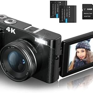 Digital Cameras for Photography, 4K 48MP Vlogging Camera for YouTube with 32GB Sd Card, 3” 180° Flip Screen Compact Digital Video Camera with Flash, 2 Batteries, 16x Digital Zoom
