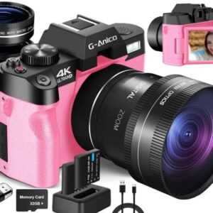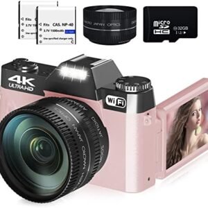 Digital Cameras for Photography, 4K 48MP Vlogging Camera for YouTube with WiFi, Manual Focus, 16X Digital Zoom, 52mm Wide Angle Lens & Macro Lens, 32GB TF Card and 2 Batteries(Pink)