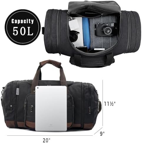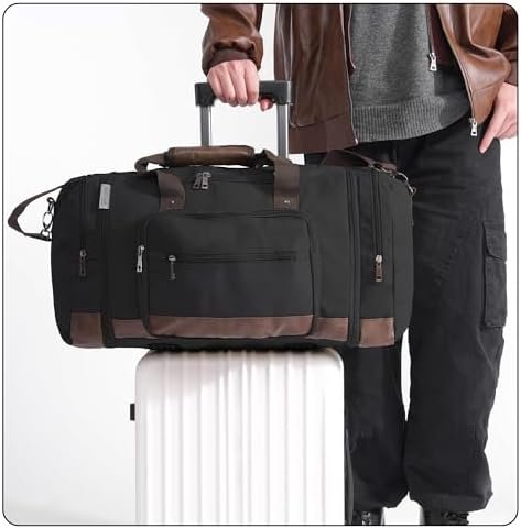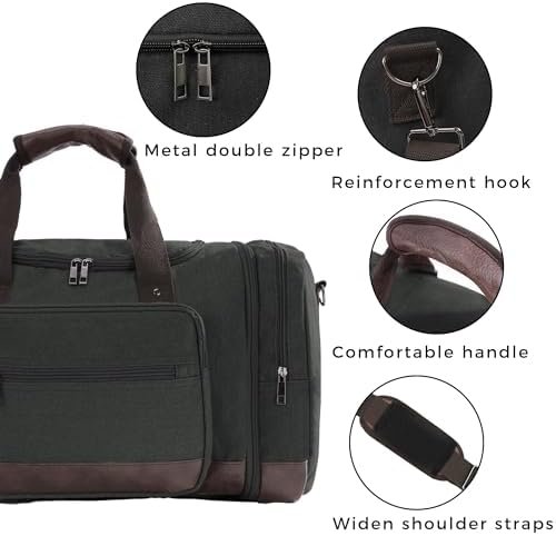 【Superior Material】Our Canvas Travel Duffel Bag is meticulously crafted from a polyester-cotton material to create a durable canvas exterior and also it is equipped with 210 D polyester interior liner & protective vegan leather bottom. The upgraded D clips and metal hardware ensure secure and reliable closure. This water-resistant and wear-resistant bag is designed to withstand any adventure you embark on, giving you peace of mind while on the go. It is also a great gift for husbands and boyfriends’ birthdays, wedding anniversary, Father’s Day and Christmas.