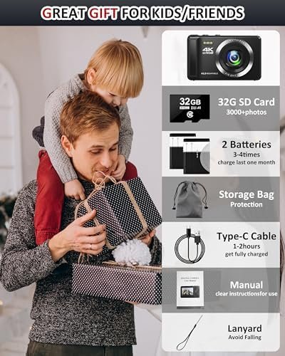 🎞️【Compact Travel Camera】The portable camera small yet powerful, weighing only 0.24 pounds with a 2.4-inch screen that captures expansive views. Included protective pouch and lanyard allow you to easily carry it on all your photography adventures. Comes with a 32GB memory card, two rechargeable batteries, and a USB data cable, ensuring you’re prepared for your next trip or vacation.
