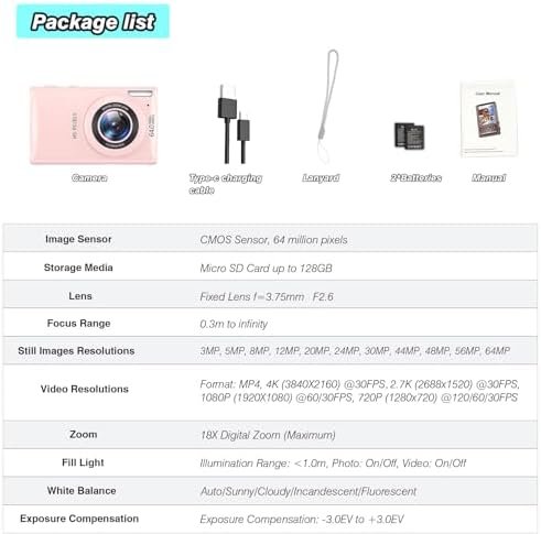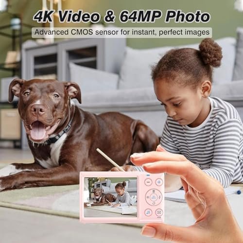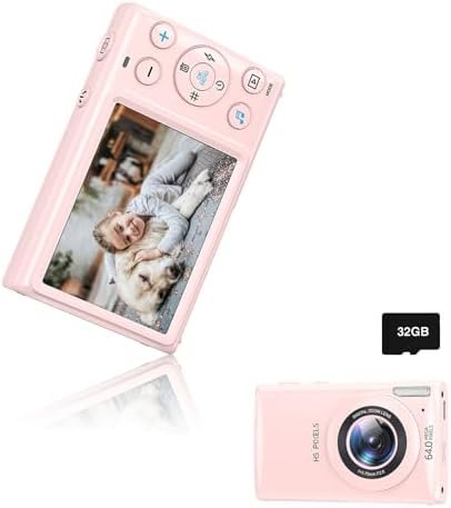 Digital Camera 4K FHD Camera 3″ 64MP Point and Shoot Digital Camera for Pictures with 32GB Card 18X Zoom Compact Small Vintage Camera Gifts for Teens Boys Girls Pink (Pink)