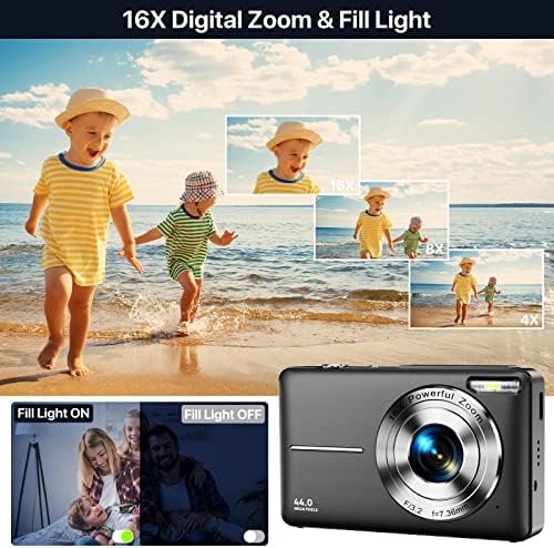 [1080P 44MP FHD Digital Camera] This kids camera featured with 1080P FHD video resolution,44MP (max) picture pixel, largely enhancing image clarity, compare with other kid cameras. This children mini camera supports 16X digital zoom, you can zoom in or out images by using the W/T button. The pause function allows you to pause when record or playback videos. And the built-in fill light helps you to take quality pictures in the dark.