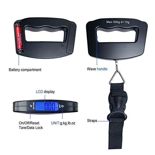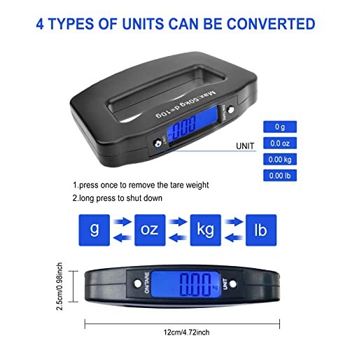 【4 Weighing Units Can Be Converted】 The digital luggage scale has 4 types of weighing units (g, oz, kg, lb) for you to use in most countries/regions. Press the UNIT button to switch the weighing unit and also switch during the weighing process. Fish scale With automatic shut-off, overload warning and low battery warning functions.