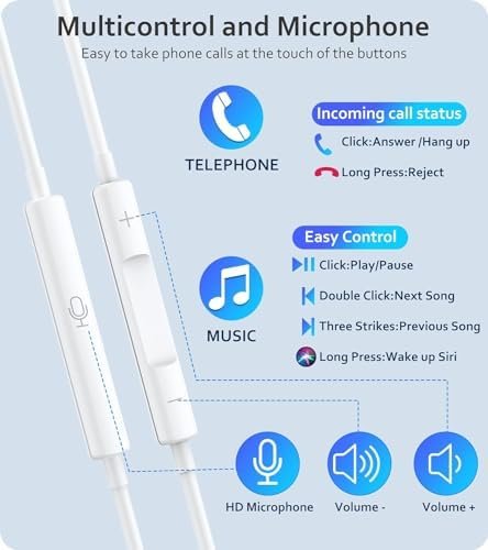 🎧👋【Multi-Function Button】: Our iPhone in-ear headphones have a built-in microphone and volume control, equipped with a high-quality hands-free microphone. Music and volume controls are designed to play/pause music, increase/decrease volume, skip to next and previous track, answer/end calls, wake up Siri. There is no need to remove your phone from your bag or pocket during these operations, freeing your hands.