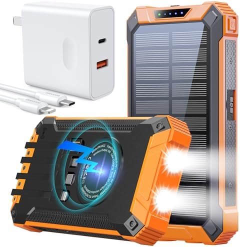 Solar Power Bank:[Built-in 4 Charging Cables] This power bank is built with 3 output cables ( Type C*1 & iOS*1 & Micro USB*1) and 1 USB-A input cable. No matter output or input, you don’t need to carry charging cables. Get rid of messy cables, charge at anytime and everywhere.
