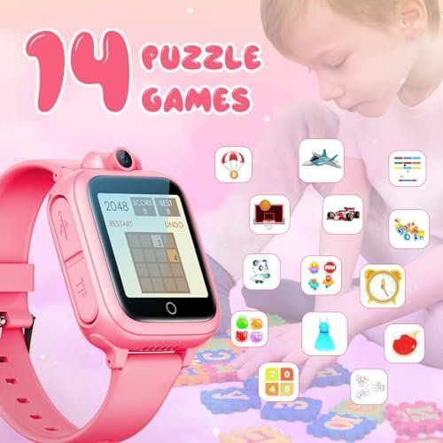 Interactive Kids Smartwatch with 14 Puzzle Games for Girls Ages 4-12, HD Touch Screen, Music Player, Camera, TF Card Slot, 12/24 hr – Pink