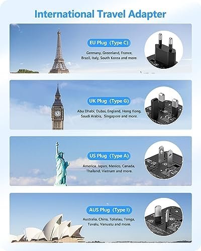 【Compact & Universal Compatibility】Portable(7.5*5.5*4.8cm) and lightweight(196g) USB adapter with interchangeable UK / US / EU / AUS plugs and international voltage compatibility, easy to carry, allows you to charge multiple devices simultaneously anywhere and anytime. Covering over 200 countries and is compatible with almost all USB devices