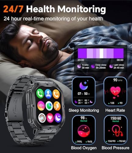 Heart Rate Monitor:Monitors heart rate 24/7, you can get heart rate intervals on the watch when it syncs with the watch and shows you all the details with charts so you know your physical condition at any time of the day, providing more in-depth insights into your health status.Blood Oxygen Monitoring:The blood oxygen function is also measured by the back sensor, which requires you to wear it correctly every time you take a measurement. The more measurements you take, the more accurate the data will be when wearing the smart watch and your skin perfectSleep Tracker:Automatically monitors and analyze sleep quality (21:00-9:00). This smart watches automatically monitors and analyzes your sleep quality, sleep time, and sleep stage (deep sleep, light sleep and wake up). The data will be recorded on the APP, and you can understand your sleep quality through the data and adjust your daily routine.Blood Pressure:Empower yourself with our smart watch for men featuring a built-in blood pressure monitoring function. Your blood pressure data is seamlessly recorded and stored in the app, allowing you to effortlessly track your health trends over time.