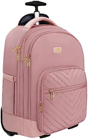 Dimensions&STURDY MATERIAL: Dimensions: 20 X 14.6 X 8.7 inch, Item WEIGHT: 4.93 pound. This rolling backpack for women is built from quality waterproof nylon material with double metal zipper, sturdy aluminum telescoping handle. Comfortable breathable mesh shoulder straps with sturdy metal hooks and strong reliable wheels design can relieve the stress from your shoulder, make it ideal for daily use and travel.