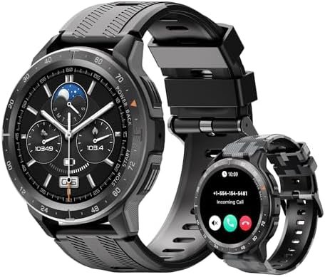 🎁🎁 The Military Smart Watch with 2 Piece Silicone Watch Straps, Bluetooth Call (Answer/Dail) and Blood Oxygen Heart Rate Blood Pressure Sleep Monitor, IP68 Waterproof Smartwatch for Android and iOS.