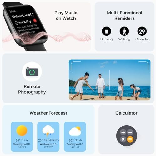 TOOLS FROM YOUR WRIST — The fitness watch has multiple useful tools: a calculator, breath training, alarm, weather, event Reminder, cycling tracker, stopwatch, timer, music control, camera control, find my phone, and so on.