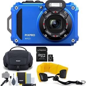 Kodak PIXPRO WPZ2 Rugged Waterproof 16MP Digital Camera with 4x Optical Zoom (Blue) Bundle with Koah Nostrand Gadget Bag, Floating Camera Strap (Yellow), and 32GB UHS-I microSDHC Memory Card (4 Items)