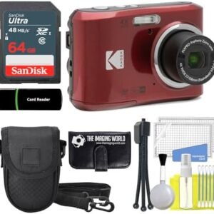 Kodak PIXPRO FZ45 16MP Digital Camera 4X Optical Zoom 27mm Wide Angle 1080P Full HD Video 2.7″ LCD Camera (Red) + 64GB Card and Reader + Case + Memory Wallet + Tripod + Cleaning Bundle